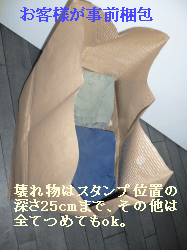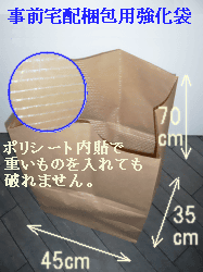 事前梱包袋10枚・エアパッキン1枚・養生テープ1個を事前宅配。レンタル段ボール10枚引越し当日持参。袋ごと格納し配送。